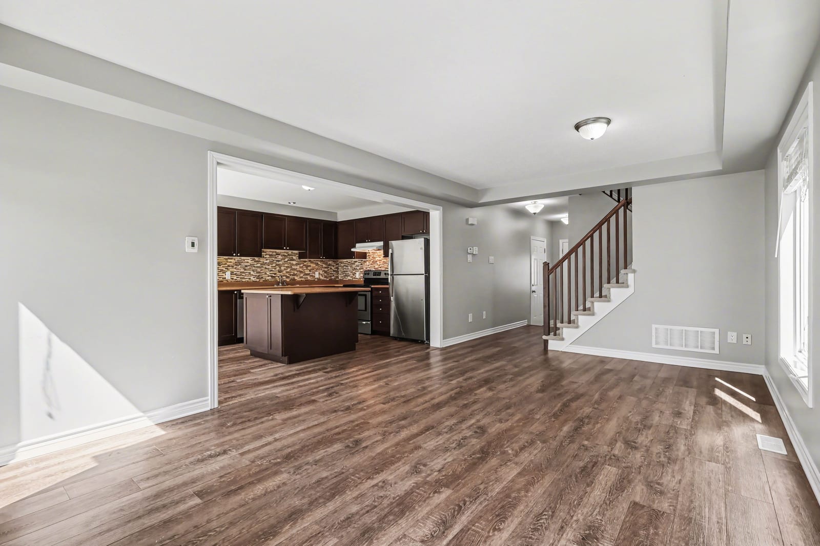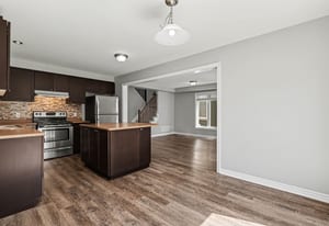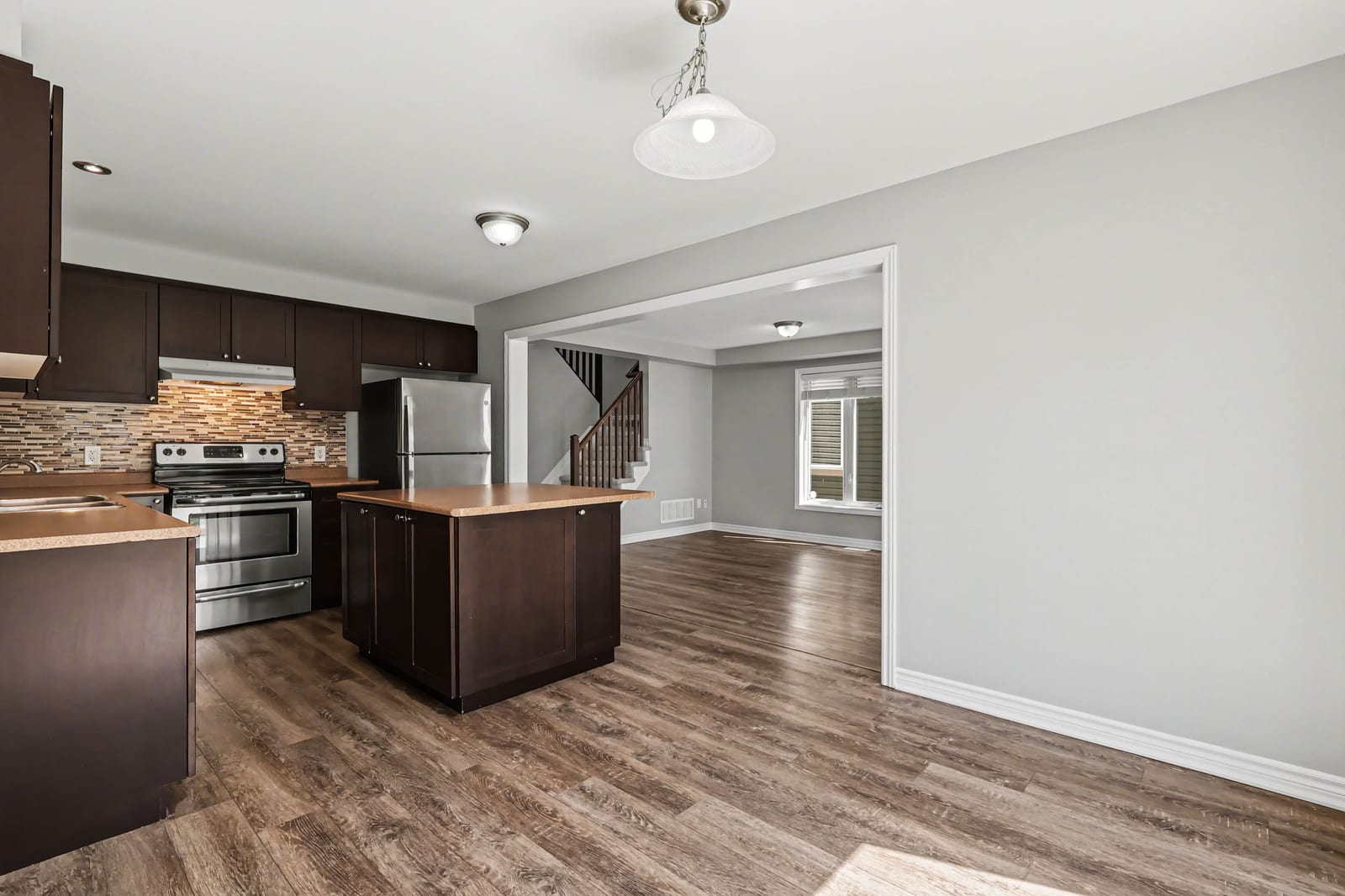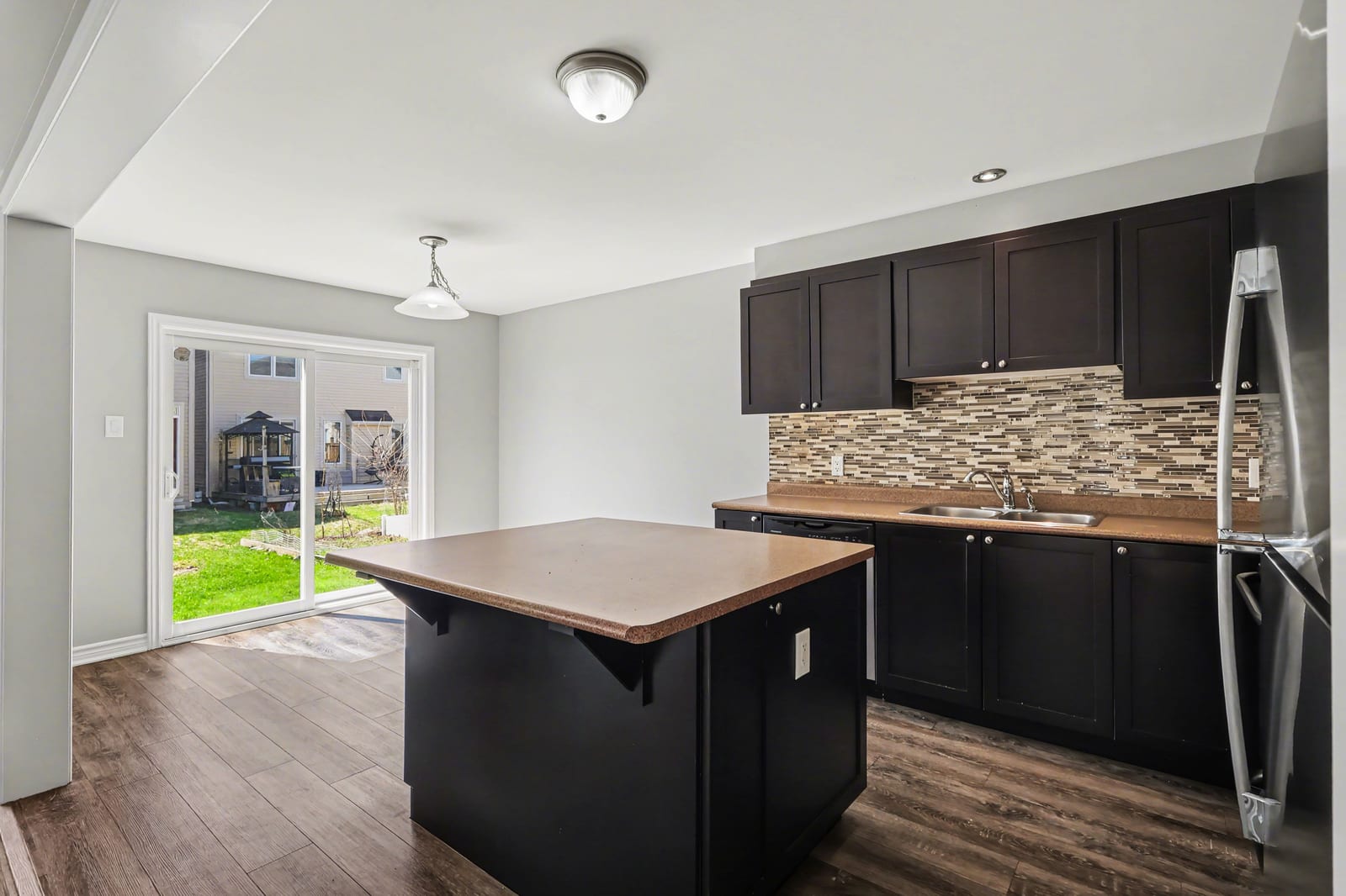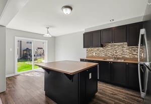 The kitchen is both practical and inviting, featuring dark cabinetry, stainless steel appliances, a tile backsplash, ample counter space, and a centre island. An adjoining eating area provides a casual space for meals and includes patio door access to the backyard. A convenient powder room and inside access to the garage complete the main level.