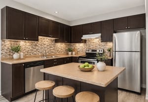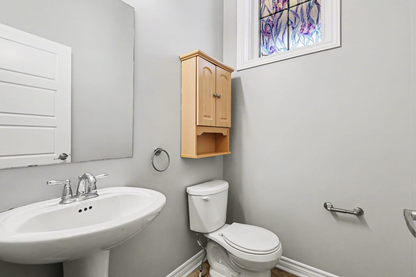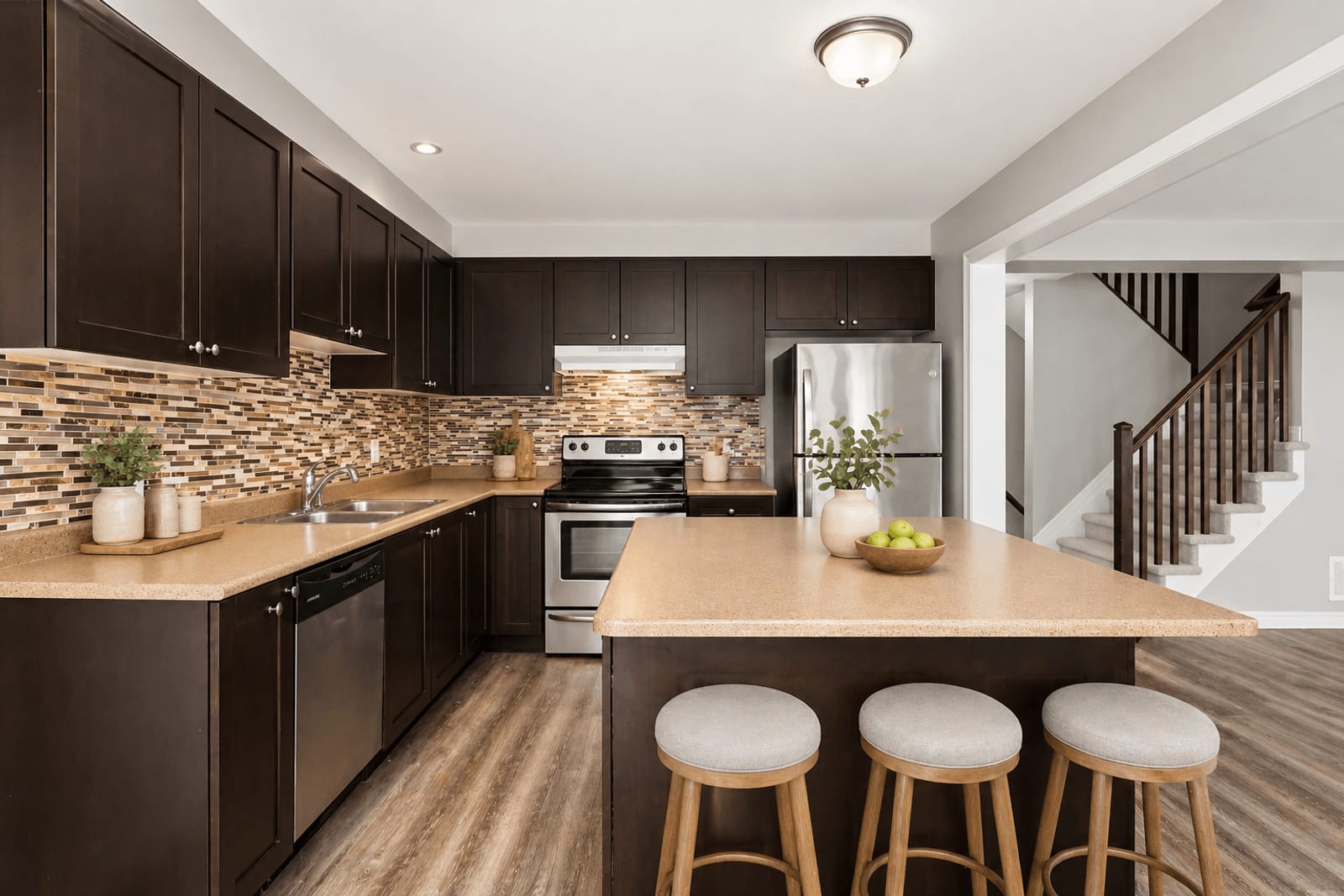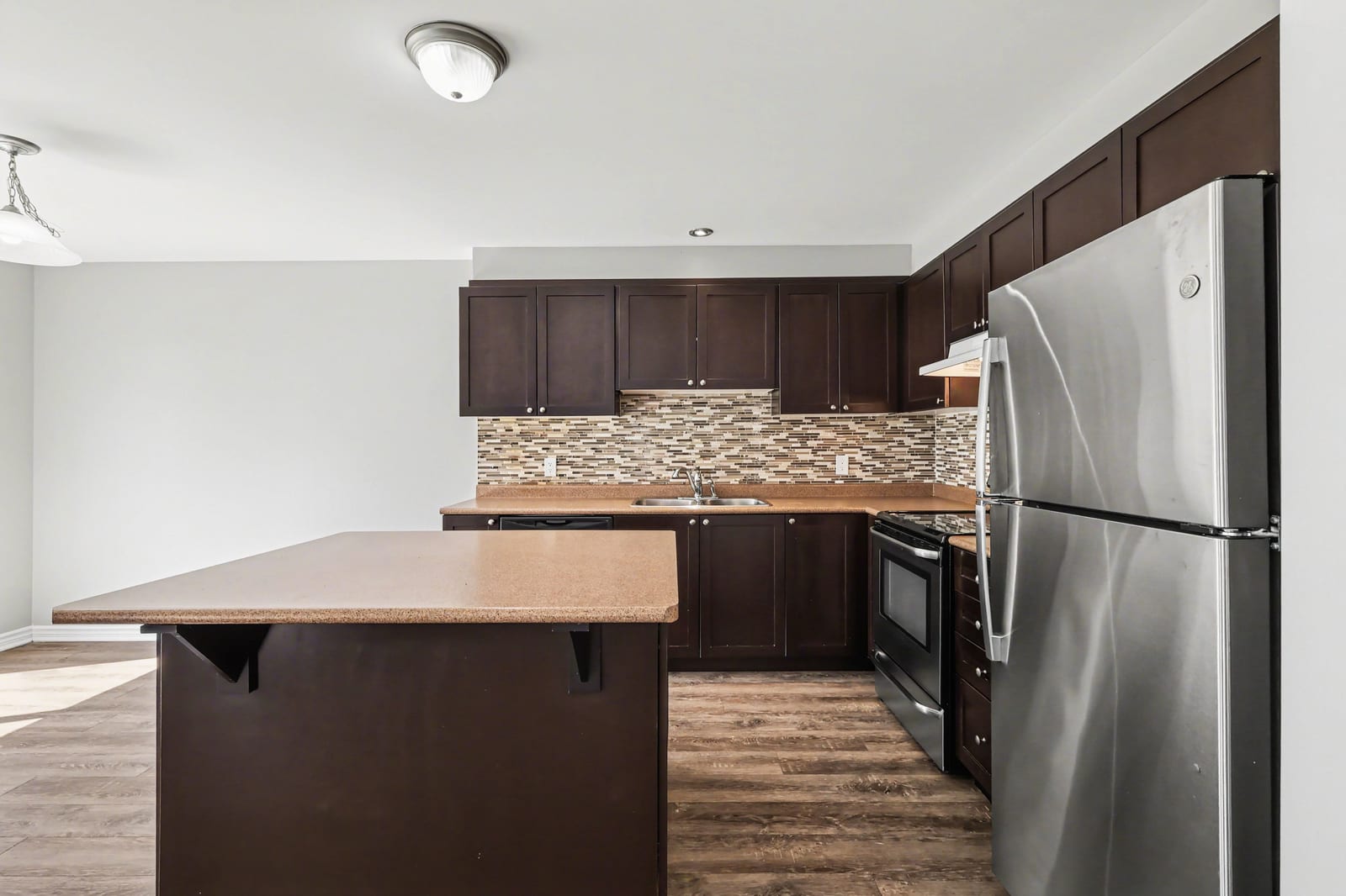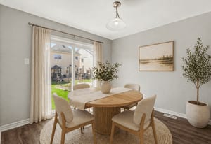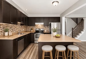 The kitchen is both practical and inviting, featuring dark cabinetry, stainless steel appliances, a tile backsplash, ample counter space, and a centre island. An adjoining eating area provides a casual space for meals and includes patio door access to the backyard. A convenient powder room and inside access to the garage complete the main level.
