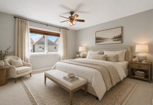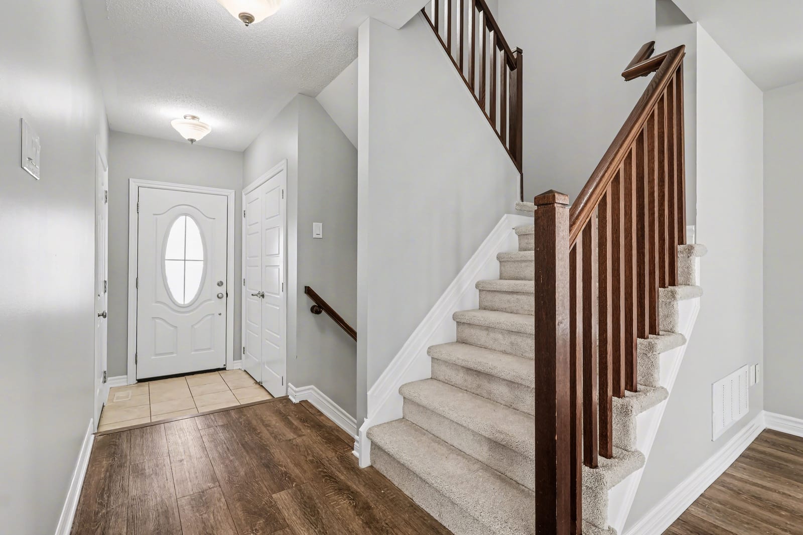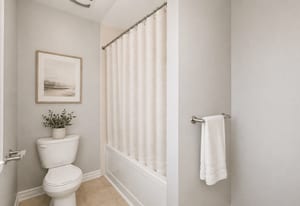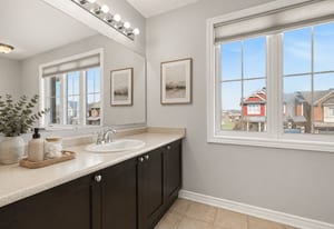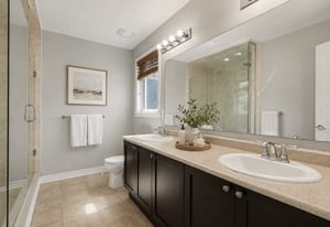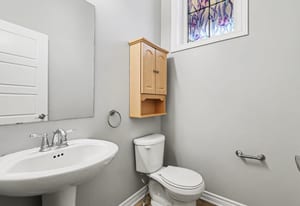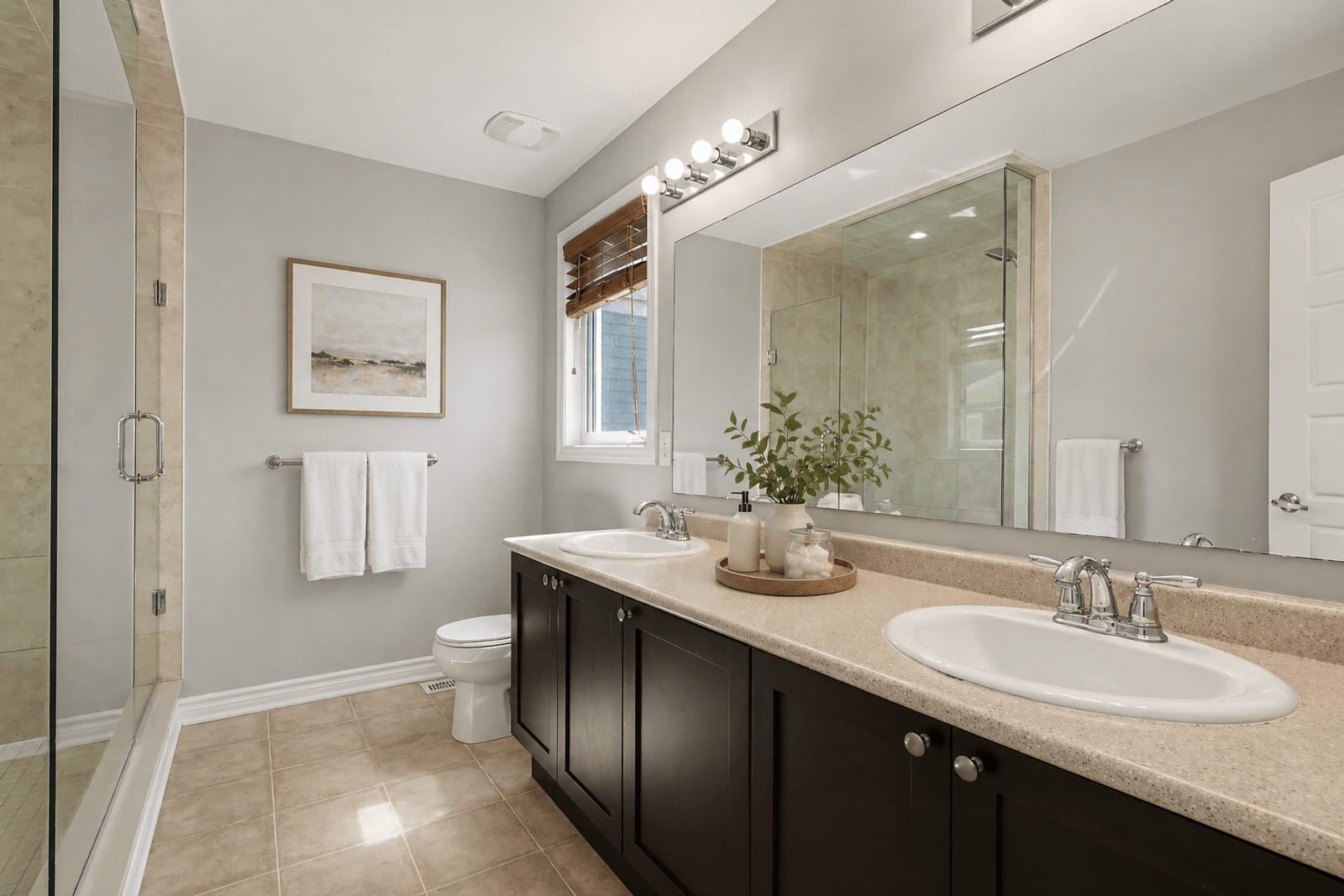 Upstairs, the spacious primary bedroom features a walk-in closet and private ensuite with an extended vanity, double sinks, and a glass-enclosed shower. Two additional bedrooms, both finished with new carpeting, provide comfortable space for children, ...