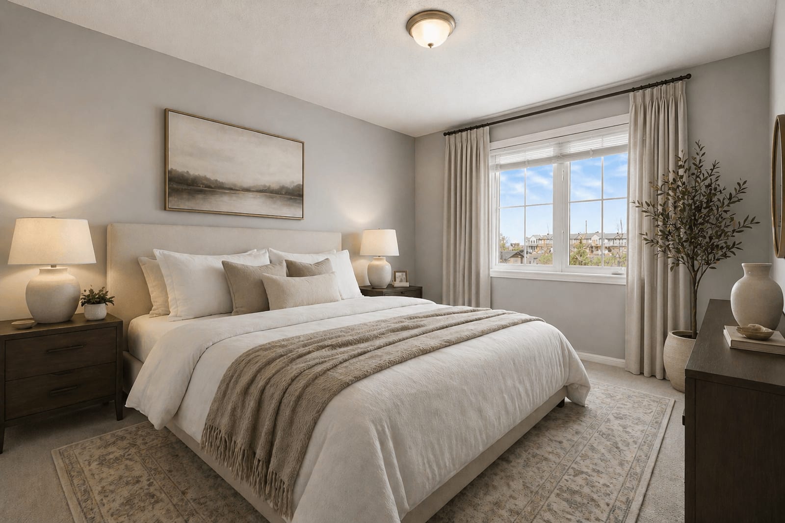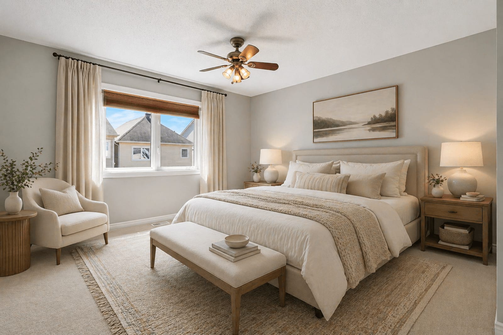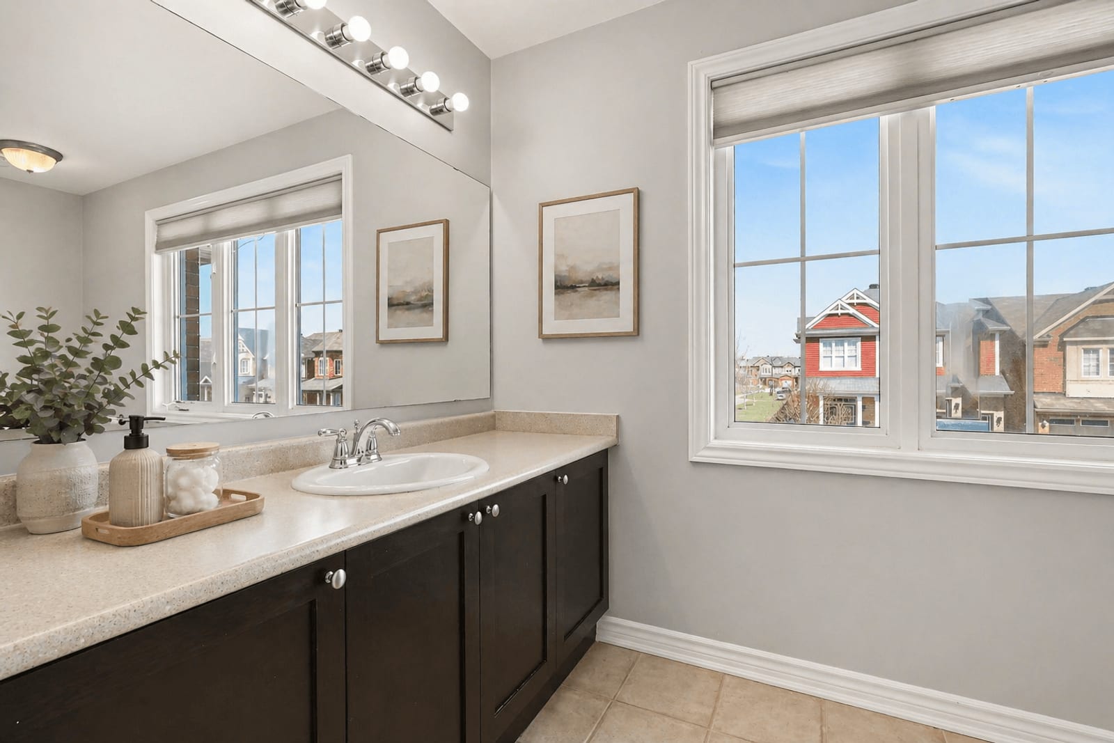 Upstairs, the spacious primary bedroom features a walk-in closet and private ensuite with an extended vanity, double sinks, and a glass-enclosed shower. Two additional bedrooms, both finished with new carpeting, provide comfortable space for children, ...